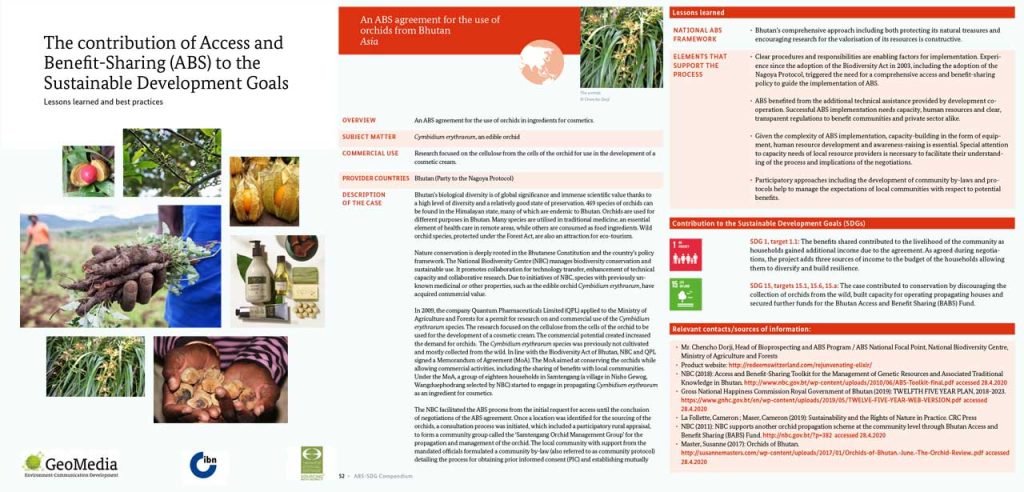 The second output was a compendium, published in April 2021, that examines eleven of the twenty cases in further detail. Each case describes the context in which ABS partnerships were developed, the actors involved, the resources accessed and the process which led to ABS arrangements, as well as lessons learnt and contributions to the SDGs. A summary analysis of key findings from all twenty cases, of lessons learntnd emerging good practices regarding the contribution of ABS to the SDGs completes the compendium.